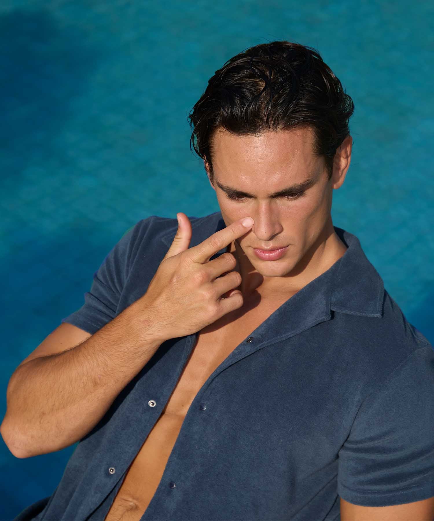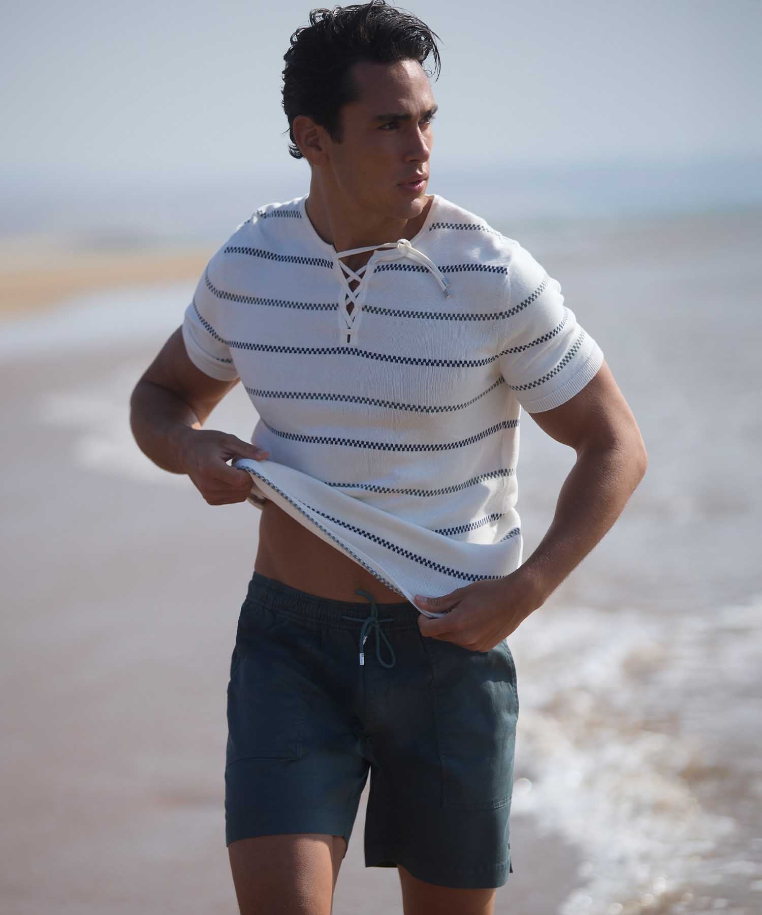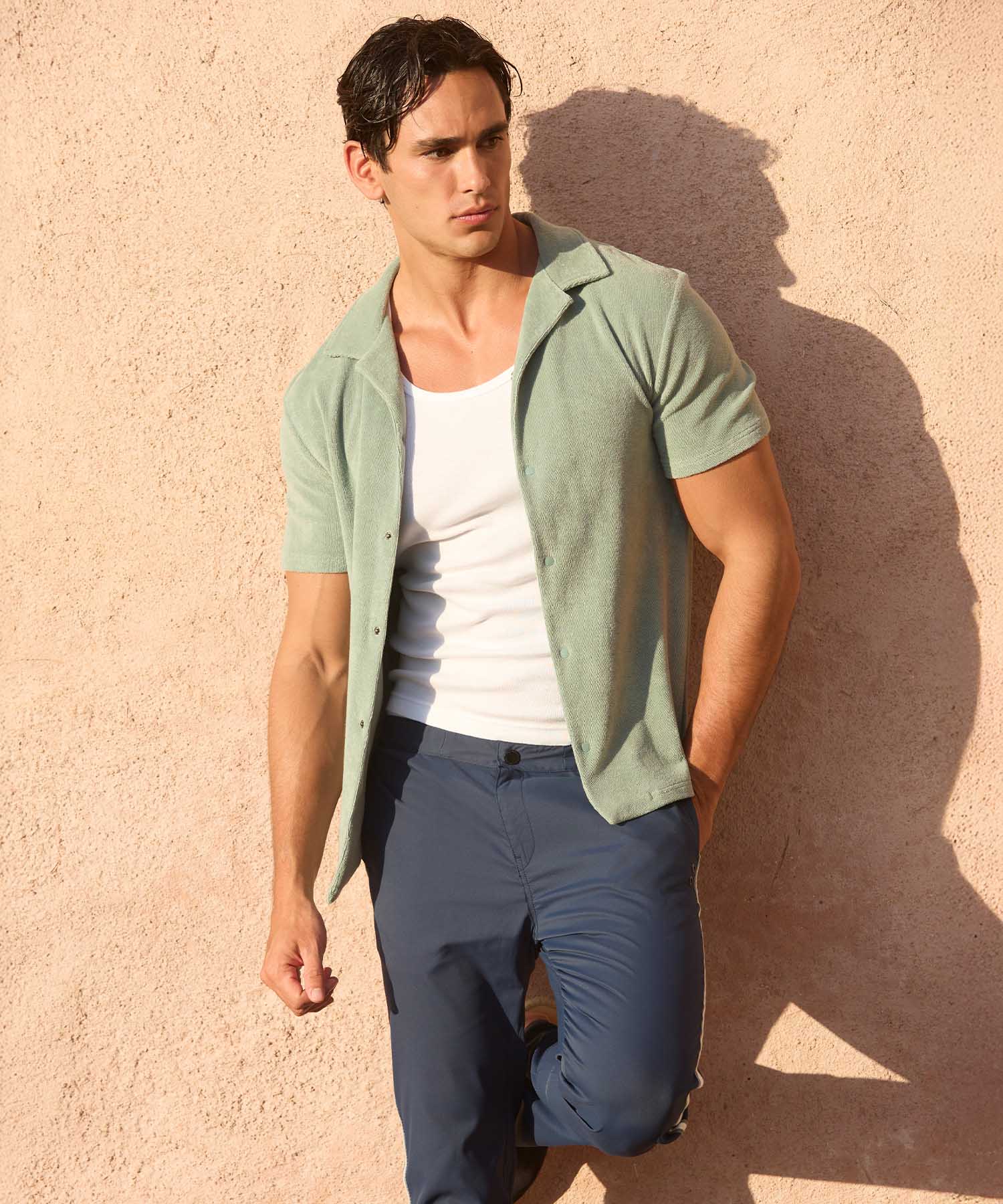 Inspired by the crystal-clear waters of a desert oasis, the Cruise Collection dives into variations of watery blues with luminous details in shades of green. Articulated around fabric mixes including cotton linen, cotton terry, cotton poplin and combining comfort and elegance for lounging in style around the pool or a drink at the bar at the end of a lazy afternoon.
