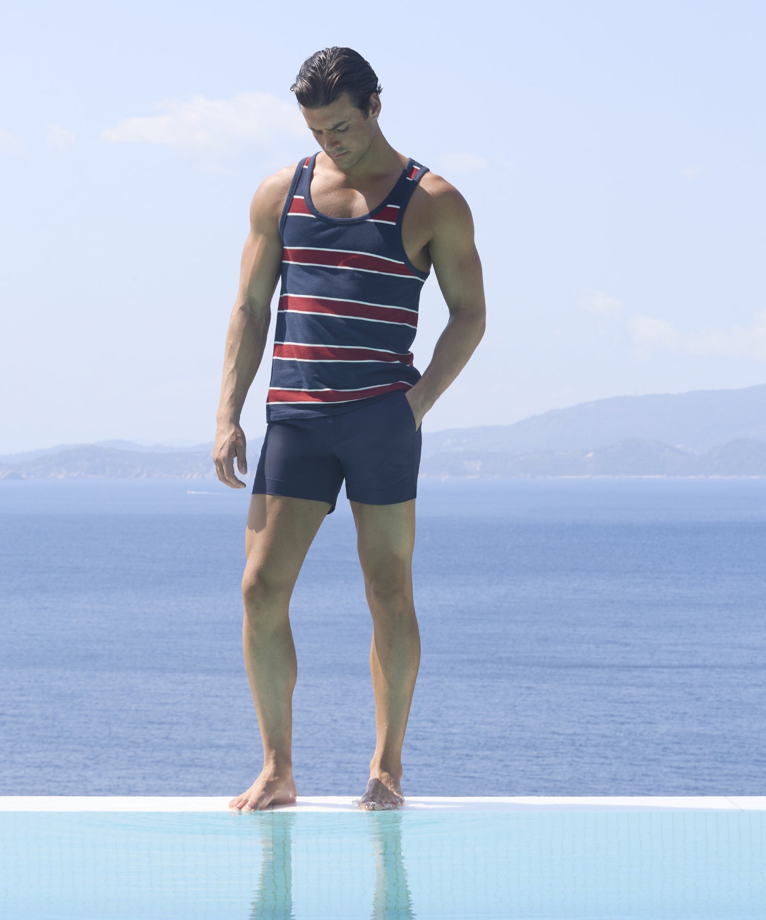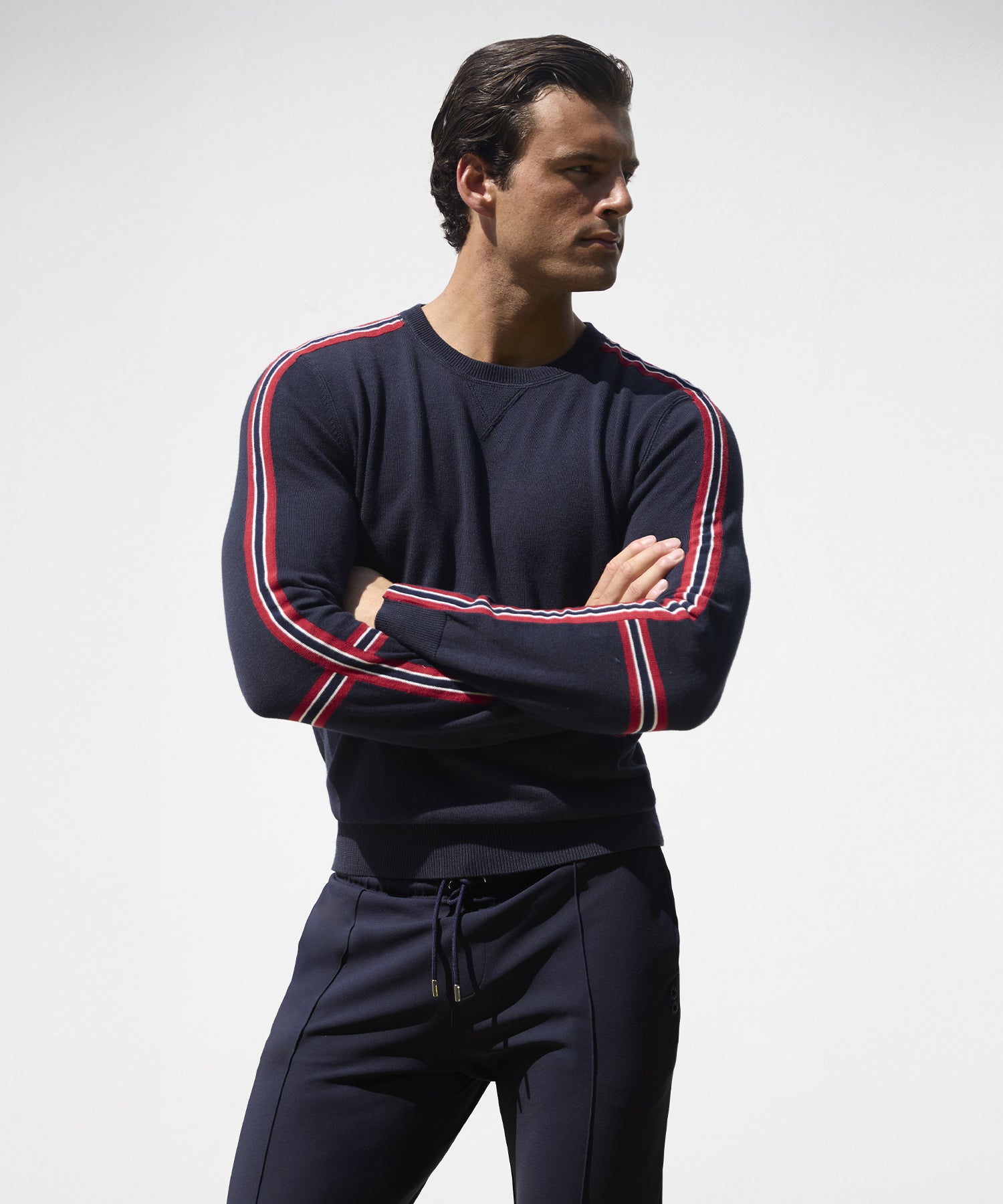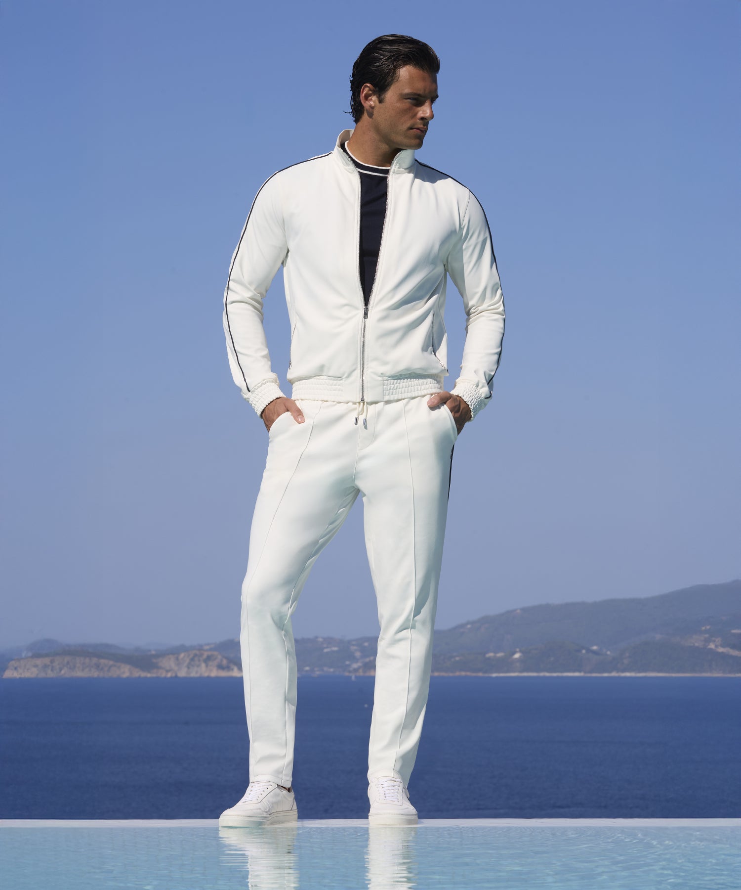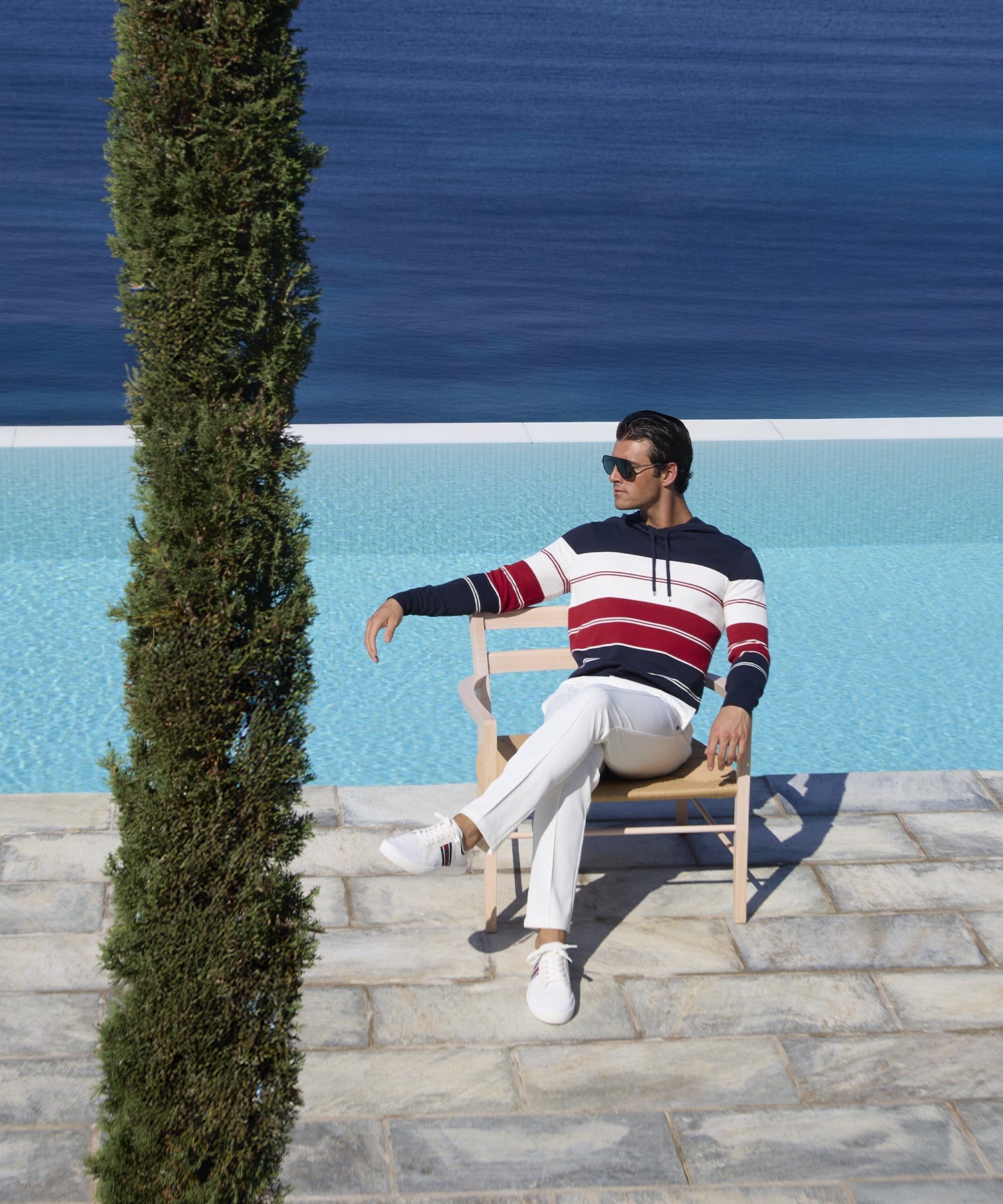Eine farbenfrohe, zugleich raffinierte Atmosphäre. Der Look ist retro, mit tiefem Rot, Off-White und Marineblau, ausgedrückt in zeitlosen Streifenmustern, inspiriert von vintage Strandliegen und Sonnenschirmen. Die Silhouetten sind präzise und klar, mit Cityhosen und Jacken, die durch kontrastierende Paspeln akzentuiert werden, um die Linie zu schärfen. Eine sportliche Eleganz, geschaffen für das Flanieren oder Auftreten entlang der ruhigen Stege der italienischen Riviera in der Nebensaison.