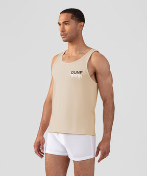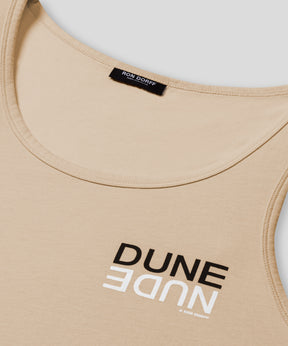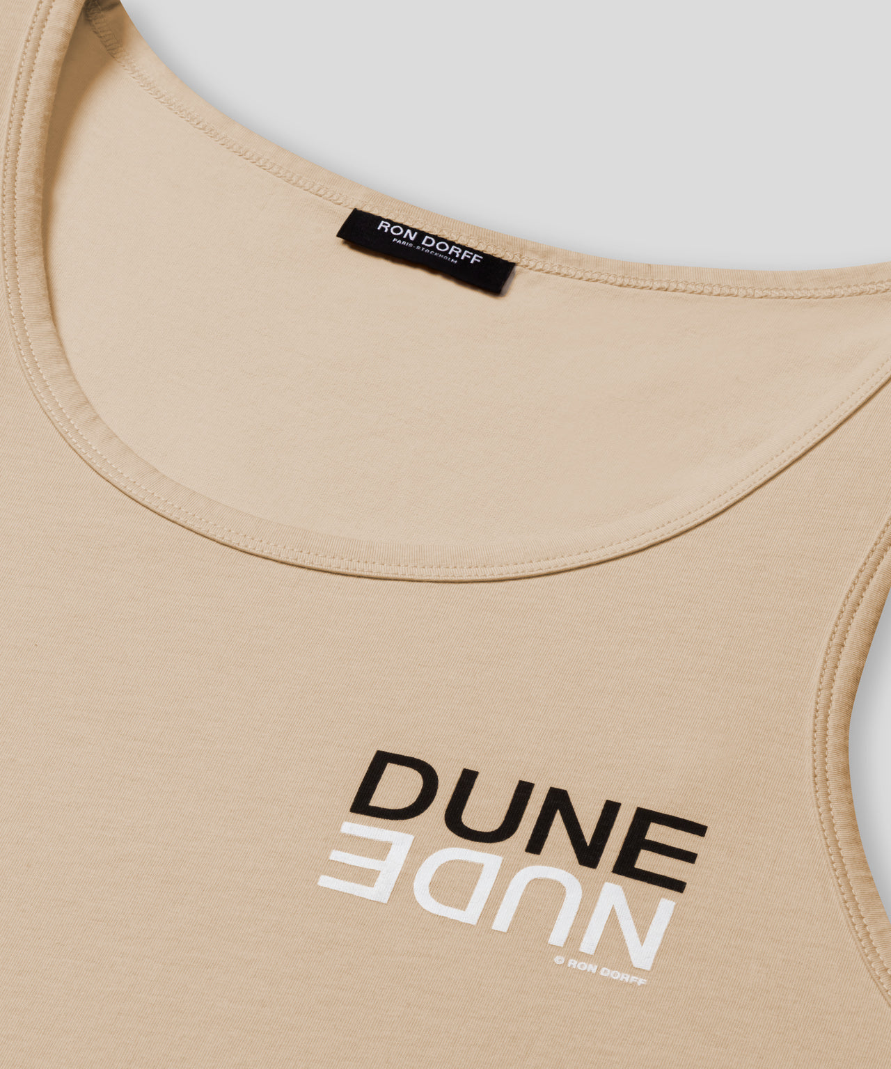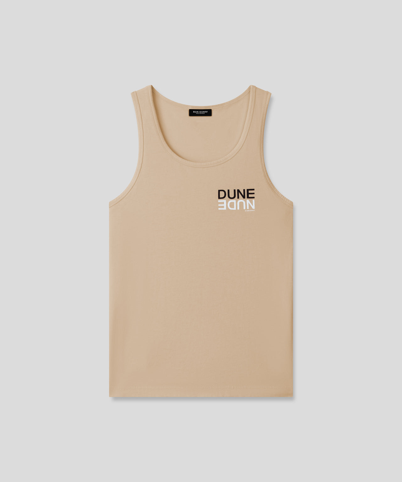 The iconic RON DORFF tank top with "DUNE NUDE" small screen print. Cut in a premium, 100% organic cotton jersey. Slightly tapered fit. Pre-washed for minimum shrinkage.