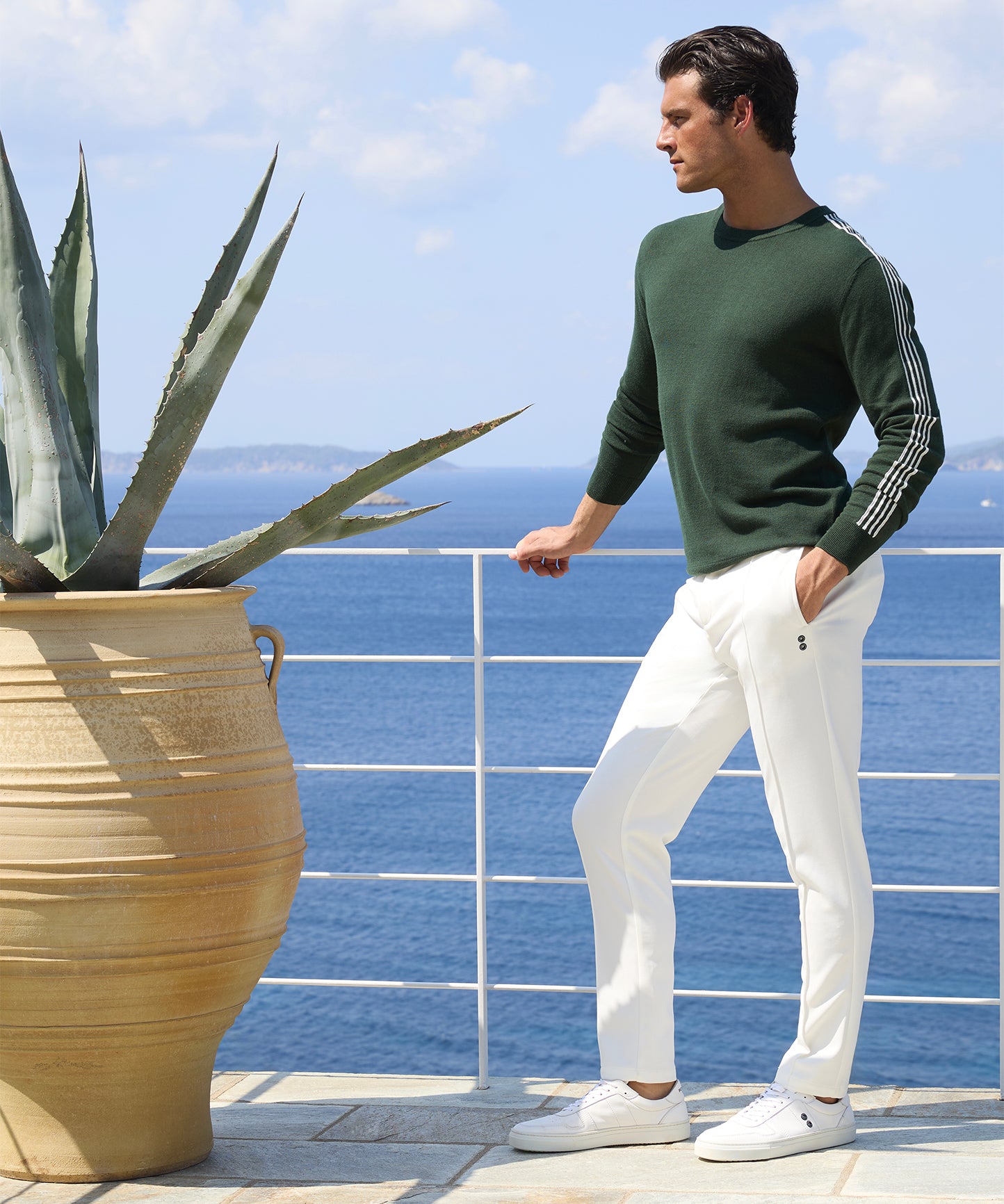 The round-neck pullover, revisited in an luxurious, ultra-soft cotton-wool mix. Ideal for early spring days and late summer nights. Double white stripes on the arms. Finished with striped ribbed cuffs, waistband and collar. Featuring the double black-lacquered RD signature eyelets on the side.